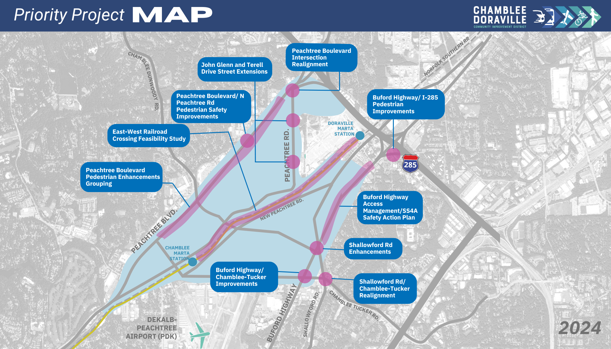 - Critical roadways: Thousands of Atlantans travel on Peachtree Boulevard, Buford Highway, I-285, and Chamblee Tucker Road each day.